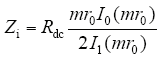 式中,I0和I1为第一类修改Bessel函数。圆导线的交流电阻为Zi的实部,内感抗为Zi的虚部。m = (1+j)/δ,j为复数运算子,j = $\sqrt{-1}$;δ为趋肤效应穿透深度,且