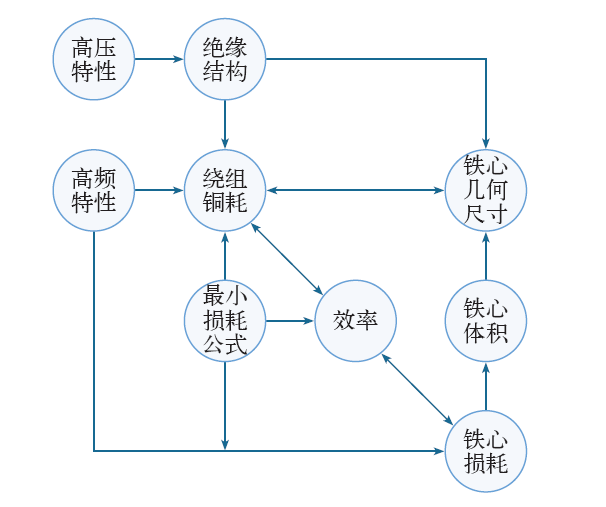 本优化方法的核心优化模块逻辑结构,如下图所示。它的特点是充分考虑了变压器的高压特性和高频特性,基于变压器的绝缘需求(并考虑散热油道)对变压器铁心的几何尺寸和变压器绕组(包括绝缘结构)进行了优化。优化出发点是依据变压器的最小损耗公式对变压器的绕组铜耗和铁心损耗进行了分配,达到变压器效率、绝缘和散热方面的最优设计目的。