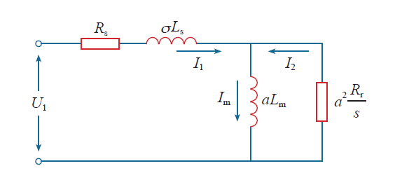 图1为异步电机T-I型等效电路,U1为定子相电压;I1、I2为定子和转子电流;Im为励磁电流;Rs、Rr为定子和转子电阻;Ls为定子电感;Lm为互感;σLs为总漏感;s为转差率;a = Lm/Ls。需要辨识的参数包括Rs、Rr、Lm和σLs。