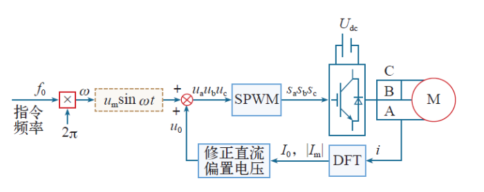 参数辨识控制框图如图2所示。图中,f0为指令频率;uaubuc为指令电压,其中u0为直流偏置电压,um1为交流分量幅值,ω为指令角频率;i为A相定子电流,I0和|Im1|分别为i的直流分量和基波分量幅值;sasbsc为逆变器三相桥臂开关管的驱动信号;Udc为直流母线电压。