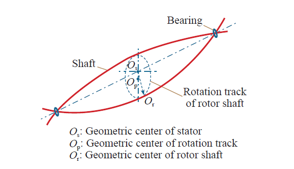 Based on rotor dynamics theory, when both ends of the horizontal shaft bearings are rigid, geometric center of shaft rotation track op is a perfect circle, while its center is located in the negative y-axis axle.
