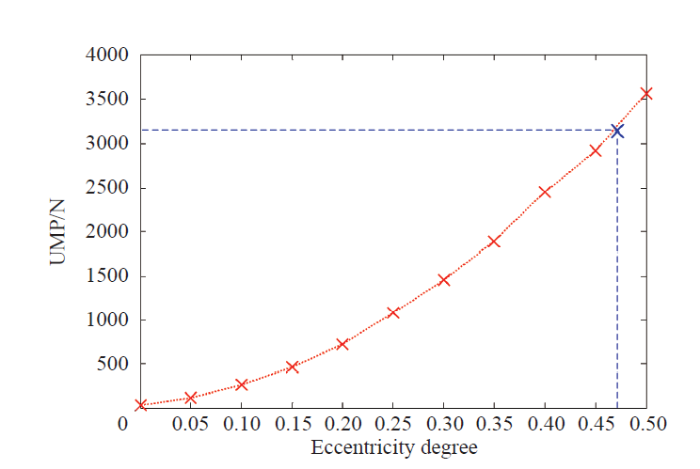 Note that the average arc eccentric eccentricity and eccentricity is equivalent parameters on arc faults of different points of the eccentric. The eccentricity of the same model, numerical two parameters are different, usually the equivalent eccentricity of eccentric arc than the average small eccentricity. The 3.10 type eccentric fault arc fitting function is represented as an example, the average eccentricity is 0.437, the equivalent eccentricity is 0.468. In Figure 4.4, the unbalanced magnetic pull between 0.437 and 0.468 corresponding to the eccentricity of nearly 1 000N.