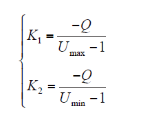 若有功功率Pn为10kW,无功功率Q为10kvar,S为14.14kV·A,电压允许范围采用法国标准,式(12)与式(13)对应的图如图4所示。