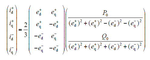 线性无功功率控制可以根据电网电压变化改变无功的输出,通过对电网注入或吸收无功调整PCC电压。根据有功功率、无功功率的给定值,经式(10)可计算出正负序参考电流矢量。