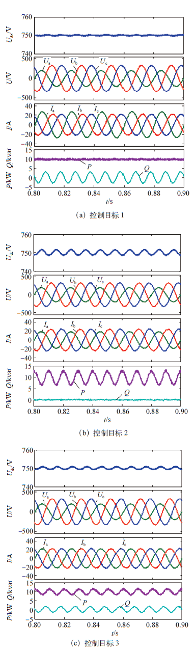控制 目标 | 控制 参数 | 并网电流 THD(%) | 并网电流 不平衡度 (%) | 直流侧电 压2倍频 脉动(%) | 有功功率 2倍频脉 动(%) | 无功功率 2倍频脉 动(%) |