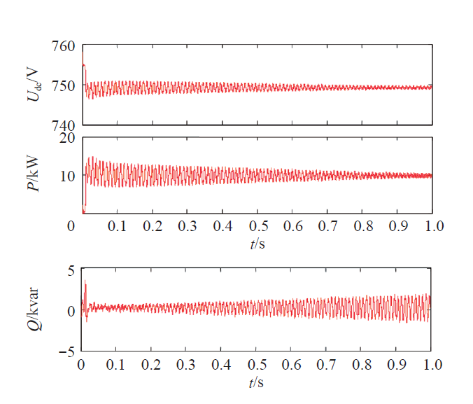 图7为参考电流矢量表达式中k和λ分别从0变化到1时的仿真结果。当λ = 0,使k从0到1变化,有功功率脉动不断减少,直流侧电压脉动也不断减少。由式(5)可知,系数Pc2、Ps2、Qc2和Qs2由电压不平衡引起,而有功功率被输送到直流侧并决定直流侧电压等级。因此,如果Pc2、Ps2不为零,直流侧电压会产生2倍频脉动,为保持直流侧电压恒定,系数Pc2、Ps2必须为零。由仿真结果可以得到直流侧电压脉动幅度正比于有功功率脉动。而当k = 0,使λ从0到1变化,并网逆变器输出无功功率明显增大。图7较好地验证了前面的理论分析,参考电流矢量表达式中的参数k和λ对并网质量有很大影响,可根据实际应用情况来优化这两个参数,从而实现三种控制目标之间的协调优化,使并网逆变器并网系统整体性能达到最优。