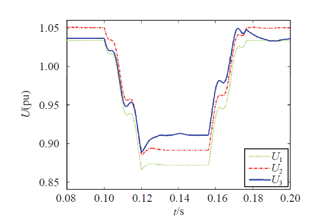 图中U1为没有接入分布式电源时PCC的电压;U2为电流内环正负序控制和功率外环逆变器固定发出10kW时PCC的电压;U3为电流内环正负序控制和功率外环线性无功功率控制时逆变器PCC的电压(电流普通控制策略不能满足并网电流谐波要求,故不考虑)。仿真结果表明,当发生不平衡电压凹陷时,对比U2与U1可知,分布式电源并网会引起PCC电压的升高,U3与U2相比更接近于额定电压。因此所提出的控制策略不仅能降低因DG并网引起的电压升高,而且能提高因不平衡电压凹陷引起的电压跌落,有效控制并网电压接近额定值的同时,也能降低并网点负序电压,降低系统不平衡度。因此该控制策略能更有效地调整分布式电源并网能力。