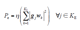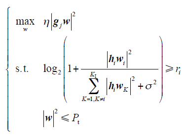 式中,hi ∈ $\mathbb{C}^{1\times M}$和gi ∈ $\mathbb{C}^{1\times M}$分别表示从发送端到信息接收端和能量接收端的信道矩阵。zi〜CN(0,σ2I,i),zj〜CN(0,σ2E,j)分别表示第i个信息接收器和第j个能量接收器上的加性高斯白噪声[10]。本文假定σ2I,i = σ2E,j = σ2。
