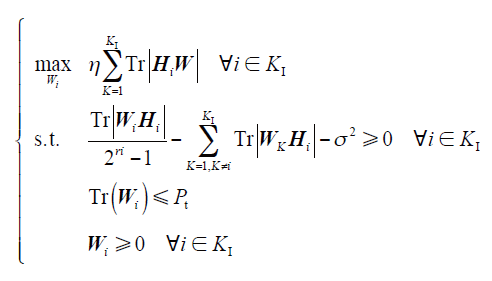 发送端发送独立的数据流si到KI个不同的信息接收端,假定si为均值为0方差为1的循环对称复高斯随机变量,即si〜CN(0,1)。发送端的波束成型矢量为wi ∈$\mathbb{C}^{1\times M}$。发送端发送的信号可表示为