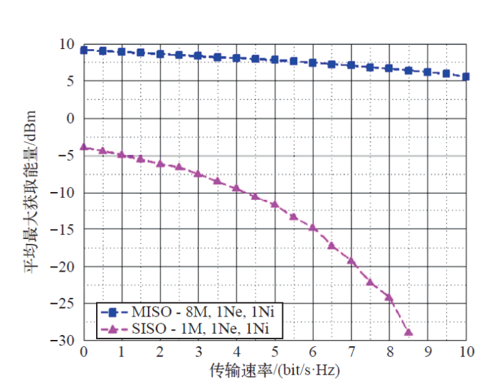本文将分两部分进行仿真验证,首先是比较MISO系统和传统的SISO以证明在传输端使用多天线技术的优越性。如图2所示,使用MISO系统时,取发送端天线数为8,获取的能量最大可达8.16MW,而对于SISO系统,获取能量最大只有0.41MW,远低于MISO系统所能获取的能量。随着传输速率的增加,MISO和SISO系统获取的能量均呈下降趋势,MISO系统下降至3.59MW,SISO系统下降至0.01MW,可见MISO系统的下降速度低于SISO系统。从仿真结果可以看出,相比于SISO系统,MISO系统可以获取更多能量,其性能及稳定性较好。