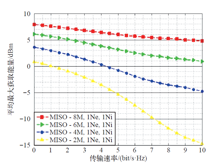 图3所示为比较当发送端天线数M不同时,接收端获取能量大小。仿真结果表明,当M分别为8、6、4和2时,接收端所能获取的最大能量为6.17MW、4.07MW、2.29MW和1.20MW。当传输速率增大到10bit/s·Hz,接收端所能获取的能量均有所下降,分别下降了51.6%、69.8%、85.4%和97.2%,下降速率随天线数的M的增大而减小。由此可以得出,传输端天线数越多,接收端可获得的能量越多,随传输速率增大而下降的速度也越慢,性能更好。