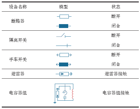 配电系统元件数量庞大、接线复杂,因此必须从复杂的网络中提取所需信息,形成可用的计算模型。而变电站内的电力网络系统规模比较小,数据的运算速度相对来说就非常迅速,而且实时性也非常高。通过量测现场设备状态,将联络线、变压器、母线、断路器、手车开关、隔离开关、电容器组、电压互感器、电流互感器和避雷器等一次设备的状态信息以及节点编号写入数据库,同时录入厂站名称、线路编号和开关编号等数据信息。再将设备连接状态绘制成可视化模型,其中电气设备可视化模型见表2,最后将设备可视化模型进行组合拼接形成厂站的主接线图,形成图模文件,包括图形文件(SVG)和模型文件(SCD),并通过104通道上传给调度中心,经过调度中心组合拼接形成全网的系统图。