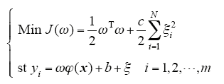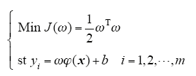 式中,ω为权值矢量;ϕ(x)为非线性映射,生产和输入向量x同维的向量;b为偏差。从而将一个非线性函数简化成为空间维度较高的线性估计函数,运用结构风险最小化的原则,确定参数ω、b,就是最小化,即