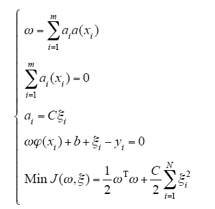 式(13)即为需要的LS-SVM模型,式中函数f(X)完全由乘子ai决定;核函数K(xi,yj) = ϕ(xi)·ϕ(xj)是满足Mercer条件函数对应空间的点积。