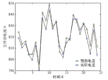 为保证测试的准确率,实验选定多个样本进行测试,由预测结果图显示,该算法预测精度高,预测模型的平均绝对误差在期望范围之内。该方法用于预测设备主传动电流的变化是可行的,但偶尔两天测试值的误差比较大,可能是因为设备维修、断路器跳闸等因素引起电流波动较大,仅凭数据很难反映出这一变化。