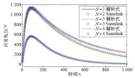 本文在Matlab中实现矩阵状态方程求解,同时在Matlab/Simulink平台上建立不同N值扩展德拜模型,对比两者模拟回复电压曲线如图13所示。其中扩展德拜模型中电容Cpn初值可通过式(3)计算,回复电压Ur初始值为零。
