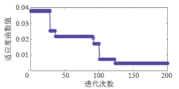 式中,U′tmax、tp′、K′为Matlab/Simulink平台模拟计算结果。Simulink-PSO联合算法运行中收敛曲线如图14所示,可见在200次迭代过程中适应度函数值逐渐下降接近于零,表明U′tmax、tp′、K′与设定值基本一致。
