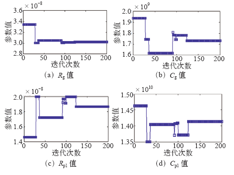 式(1)中,c1和c2为两个正常数,称为学习因子;r1和r2为[0,1]区间内的随机数;vdmax为粒子在d坐标方向上的速度限值。根据集总参数扩展德拜模型的拓扑结构可知,其反演变量包括几何电阻Rg和几何电容Cg,支路电阻、电容Ri、Ci(i = 1~N)。Simulink-PSO联合算法反演扩展德拜模型的流程如图12所示[17,18]。首先在Matlab/Simulink平台将待反演参数设置为变量,初始化粒子群,随机产生所有粒子的位置和速度,并确定粒子的Pt和Gt。对每个粒子将其适应度值与该粒子所经过的最优位置Pt和Gt的适应度值进行比较,若较好则将其作为当前的Pt和Gt,并按式(1)更新粒子速度和位置,适应度值通过运行图8所示仿真电路获取。