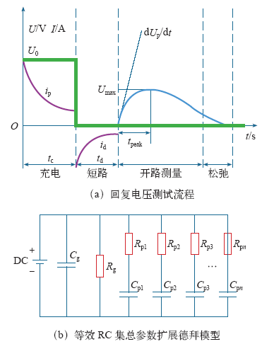 另一方面,回复电压测量中的特征参量变化规律可应用等效RC集总电路模拟,如图3b所示,包括几何电容Cg、电阻Rg,表征油纸复合绝缘系统弛豫过程的支路电容Cpn、电阻Rpn。不同绝缘介质区域将有不同的极化时间常数τ=RpnCpn,极化过程主要由油纸复合绝缘介质内部空间电荷和界面电荷消散引起。对于N支路等效RC集总电路扩展德拜模型,可模拟回复电压测试流程,便于应用理论公式进行解析。