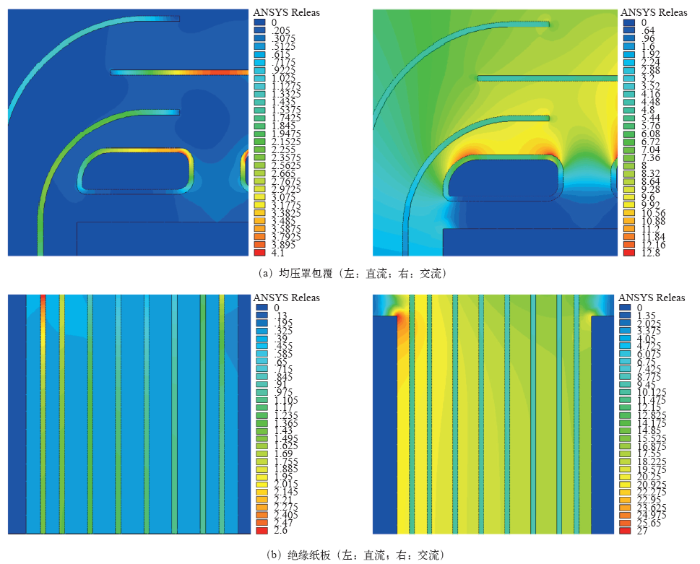 (1)在ANSYS仿真计算环境下建立了配电变压器典型油纸绝缘系统模型,计算结果表明交流电压下最大场强集中在变压器油中,直流电压下最大场强集中在绝缘纸板中,纸板结构对变压器油具有导向作用,同时能调制等位线分布情况。