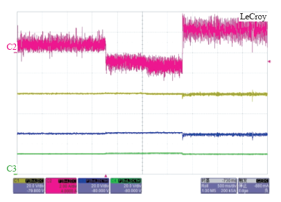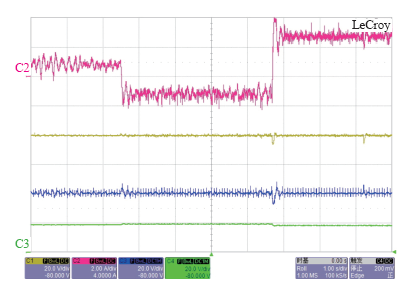 图10为对级联式双向DC-DC变换器进行传统双闭环控制的实验波形,其中红色线为蓄电池充放电电流,黄色线为直流母线电压波形,蓝色线为第一级双向DC-DC变换器高压侧电压波形,绿色线为蓄电池两端电压波形。