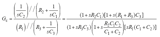 此有源超前—滞后补偿网络有两个零点、三个极点,分别对其进行设计,可得R1 = 3.92kΩ,R2 = 10kΩ,R3 = 54.4kΩ,C1 = 5.7nF,C2 = 0.8pF,C3 = 14.5nF。代入相应参数,可以得到补偿网络Gc(s)的传递函数。