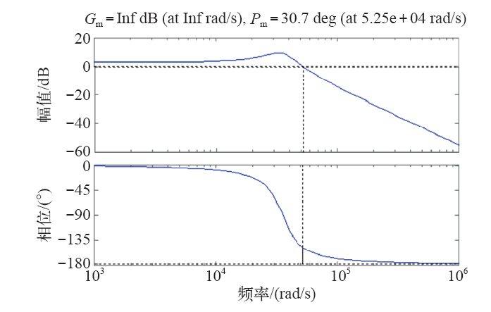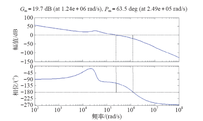 经补偿后的回路增益函数G(s)的Bode图如图6所示。可以看出,G(s)在低频段有较高增益,同时以-20dB/dec斜率下降,保证系统拥有较好的稳态精度;幅频特性在40kHz处以-20dB/dec穿过零分贝线,相位裕度为63.5°,幅值裕度为19.7dB,保证系统具有较高的稳定裕度。