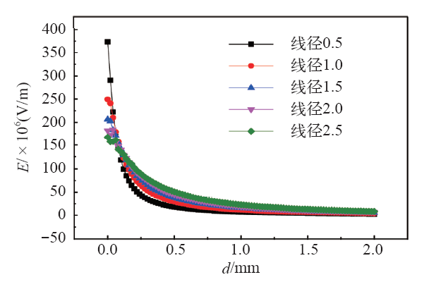 高压电极线径选取0.5mm、1.0mm、1.5mm、2.0mm、2.5mm。激励电压设定为15kV。以高压电极与介质的切点为坐标原点(0,0),建立坐标系,选取与上文同样的路径,考察5种线径下该路径上的电场强度。在该路径上,仿真得到5种线径下电场强度如图3所示,横坐标为距离坐标原点的距离d,纵坐标为电场强度。