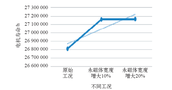 根据之前仿真得到的永磁体宽度分别改变10%及20%的电机温度来计算电机寿命。变化曲线如图12所示。