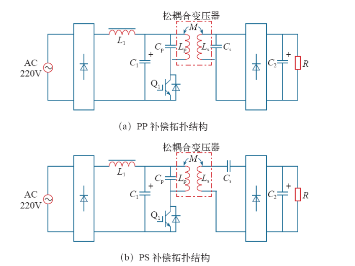 PP补偿拓扑单管ICPT系统具有电压增益高且传输效率、功率因数较高等优点,但输出电压、开关管电压在动态非线性负载突变时波动很大,经常造成器件损坏,降低了系统的可靠性;而PS补偿拓扑单管ICPT系统具有传输效率较高,输出电压、开关管电压在动态非线性负载突变时波动较小等优点,但电压增益较低[13]。对于果蔬机类负载来说,可以通过优化系统参数来提高PS补偿拓扑的电压增益,以满足要求。