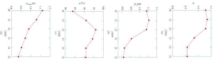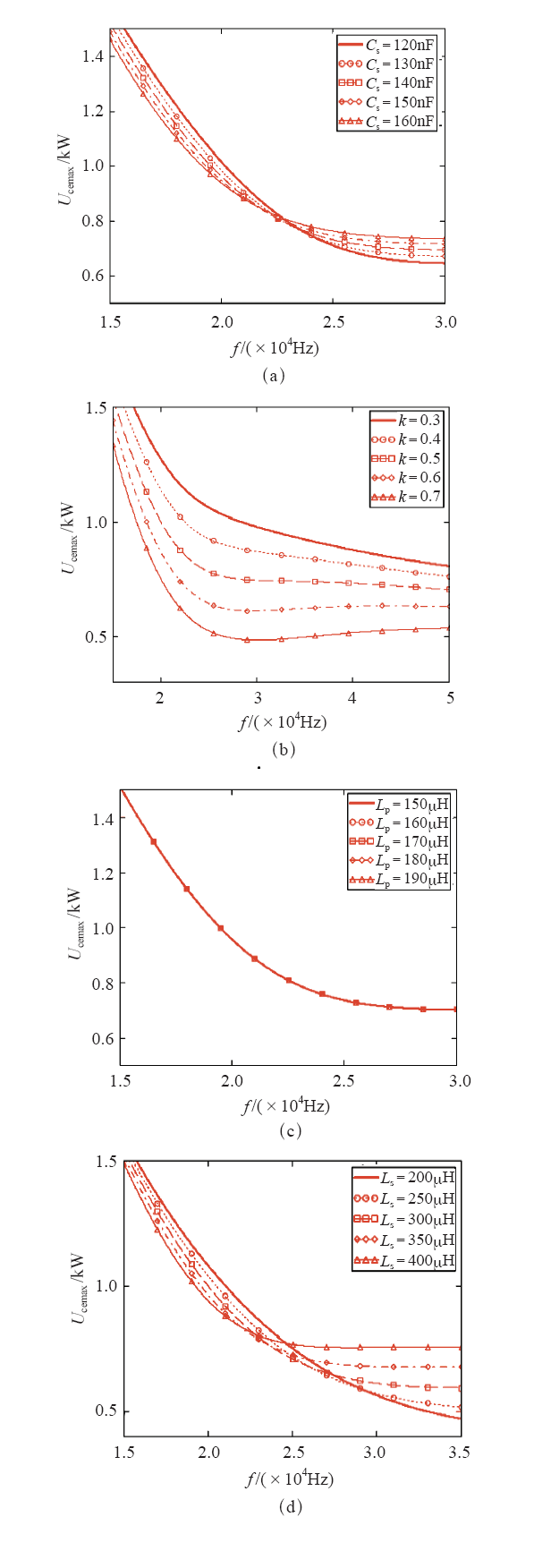 由图5可知,对于PS补偿拓扑的单管ICPT系统来说,存在一个工作频率使电压增益达到最大。由图5a可知,二次补偿电容的增大,对电压增益的峰值没有影响,但会使电压增益曲线近似向左平移;由图5b可知,当耦合系数发生变化时,电压增益曲线大致呈上下平移的关系,随着耦合系数的增加,电压增益的峰值会增加,同时可以发现当耦合系数增大时,电压增益的峰值点会偏离谐振频率处,因此要适当选取耦合系数,不宜过大,否则电压增益的峰值点偏离谐振频率过远;由图5c可知,随着一次电感的增加,电压增益的峰值会减小,同时会使电压增益曲线近似向下平移,因此一次电感不宜太大;由图5d可知,二次电感的变化不改变电压增益的峰值,二次电感越大,电压增益曲线在各自的谐振频率附近越陡峭,相应的输出电压在各自的谐振频率附近变化越大,对要求恒压输出的单管ICPT系统来说不易控制,因此要选取的二次电感不宜过大。