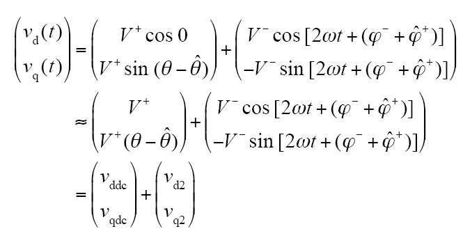 式(5)表明,在dq系下,直流分量vqdc表征正序分量的相位偏差信息,幅度与V+相关;二倍频扰动{vd2、vq2}表征原负序分量,其幅度与V-相关。为适应电压不平衡,利用SRF-PLL方法准确检测到正序分量相位,需对鉴相信号vq滤除二倍频扰动分量vq2,只保留直流分量vqdc。