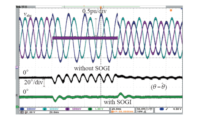 图7给出了谐波污染情况下的仿真结果,0.1s时刻,vabc加入3次、5次、7次谐波,幅值分别为0.3pu、0.2pu、0.1pu(为模拟不对称状况,a相中的5次谐波幅值为0.6pu),SOGI虽不能完全消除高次谐波的影响,但衰减作用显著,相位检测值稳态误差从±6°降低至±1.5°。