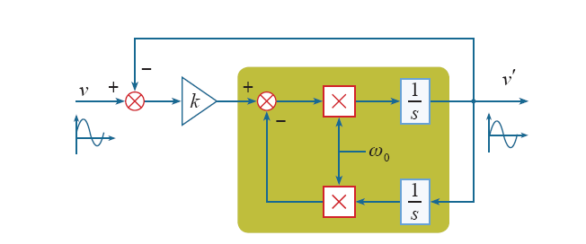 为消除这一稳态误差,适当降低PLL系统的带宽,增强其抗扰性能,代价是系统动态响应会受到影响。另一种方案是在SRF-PLL环内或者环外应用各种类型的滤波器,通过附加滤波来获得准确的相角偏差信息,降低甚至消除稳态误差[5]。针对电压不平衡,本文介绍了一种利用二阶广义积分器(SOGI)进行SRF-PLL环路内滤波方案,首先分析了电压不平衡时鉴相器输出信号特征,对SOGI的带通特性及其数字化实现做了详细的讨论,数字仿真结果表明,SOGI对不平衡电压的锁相效果有良好的改善作用,同时适应一定程度的谐波污染情况。最后,基于TMS320F28335控制器的实验平台实现了该方法,测试波形验证了其良好性能。