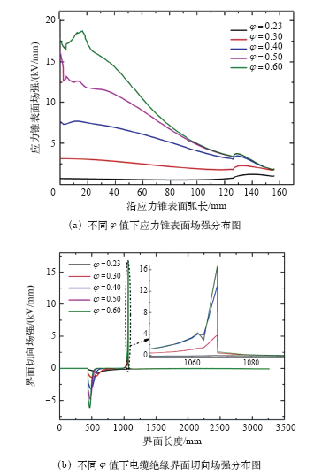 取材料系数A = 5.39×10-3V/(Ω·m2)、电场依赖系数B = 3.48×10-7m/V,改变活化能ϕ值,仿真得到应力锥表面场强和XLPE界面切向场强与活化能ϕ的关系如图7所示。