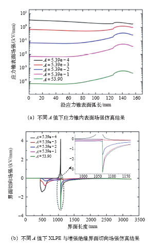 取电场依赖系数B = (3.48×10-7)m/V、活化能ϕ = 0.23eV,取不同系数A值仿真得到界面切向场强和应力锥表面场强分布与电场依赖系数A的关系如图5所示。