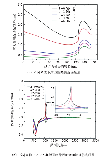 取A = 5.39×10-3V/(Ω·m2),活化能ϕ = 0.23eV,改变电场依赖系数B值,仿真得到应力锥表面场强和XLPE绝缘界面切向场强分布与电场依赖系数B的关系如图6所示。