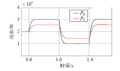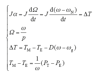 式中,α为机械角加速度;J为转动惯量;Ω为转子机械角速度;TM、TE分别为机械转矩和电磁转矩,对应PT、PE分别为机械功率和电磁功率;ΔT为作用在转子轴上的不平衡转矩;ω、ωg和ωN分别为实际电角速度、电网电角速度和额定电角速度;D为阻尼系数;p为极对数,为简化模型取p = 1;PN、QN、P和Q分别为额定有功功率、额定无功功率、输入有功功率和输出无功功率;Dp、Dq分别为P-f下垂系数和Q-u下垂系数。