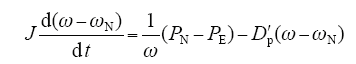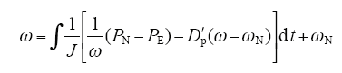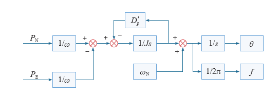 在虚拟同步机控制策略中,P与PT具有相同的物理意义,即P = PT;并在电网频率偏移量较小的情况下,可近似取ωg = ωN,结合式(1)、式(2)可得