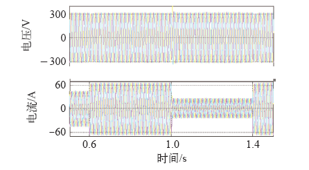 系统在初始状态下带负荷20kW在离网状态下运行,为了验证虚拟同步机的动态性能,在0.6s时突增负荷10kW,在1s时突减负荷20kW,在1.4s时突增负荷20kW,虚拟同步机输出电压、电流波形如图4所示。虚拟同步机输出电压能保持恒定,当负荷突变时,电流能够快速响应。