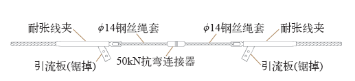 耐张塔处的旧导线连接时,利用原导线耐张线夹,锯下耐张线夹引流板并锉除棱角,两根耐张管之间用经过长度校验的两根φ14钢丝绳套和一支50kN抗弯连接器连接,如图5所示。