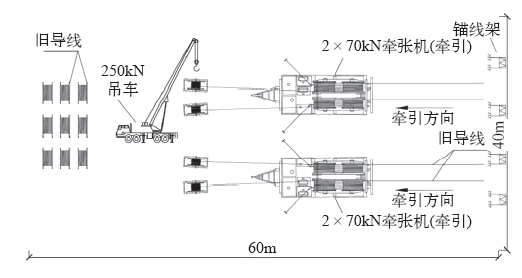 常规的张力放线施工中,通常牵引场布置一台主牵引机。由于受到牵引机线轮尺寸的限制,导线无法进入牵引机线轮,这也决定了常规的施工工法无法使用旧导线直接牵引新导线,必须先拆除旧导线,然后人力或飞行器展放导引绳,再过渡到牵引绳,牵引导线展放[2]。