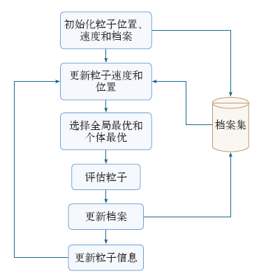 (3)确定非支配解。根据支配关系进行第一轮筛选,将劣解去除后剩余的解加入到存档中。在存档中根据支配关系进行第二轮筛选,将劣解去除后计算存档粒子在网格中的位置。若存档数量超过了存档阈值,则根据自适应网格进行第三轮筛选,直到阈值限额为止,再重新进行网格划分。