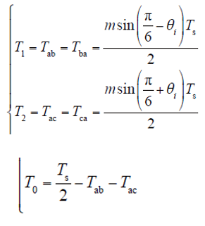 以图6所示扇区1矢量合成顺序图为例,当参考电流Ir位于扇区1时,一个开关周期的前半周期,由扇区相邻的2个有效矢量Iab、Iac及零矢量合成Ir,此时RMC输出正向电流Im,变压器一次电压为Uab、Uac。对应的各矢量作用时间计算式为