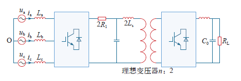 1999年,E.Cengelci等学者提出了三重线电压级联变换器(Line Voltage Cascade,LVC)拓扑结构,应用于中压可调速系统中,通过仿真验证其具有电压变化率低、谐波含量低等优点。Jun Wen和Keyue Smedley等提出通过限流电感把6个三相两电平电压源逆变器输出依次串联叠加得到六相输出,并将其应用于可调速六相电机。文献[1]提出一种三相线电压级联结构,由3个三相全桥逆变器的三相桥臂直接级联,输出线电压由子模块线电压叠加而成。文献[2]通过改变三相桥臂的连接方式,提出了一种新型线电压级联结构,使其更易于向更高级联数扩展。上述大部分研究均以基于传统两电平六开关功率变换器的三相级联变换器为研究对象,传统功率变换器中间环节包含的直流电容不仅降低了系统的可靠性,同时还会增加系统的体积与成本。此外,在实际应用中,基于电压等级的变换、安全、隔离等原因,往往需要将变换器采用隔离结构。