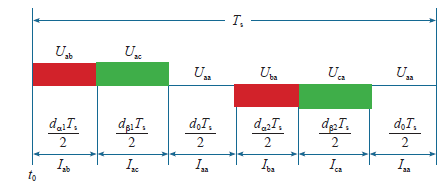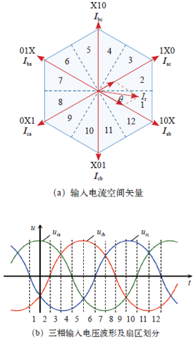 同理,在划分的12个扇区中,每个扇区三相输入的相对大小确定。通过安排合理的有效矢量作用顺序,便可以实现有效矢量切换时的一步自然换流。