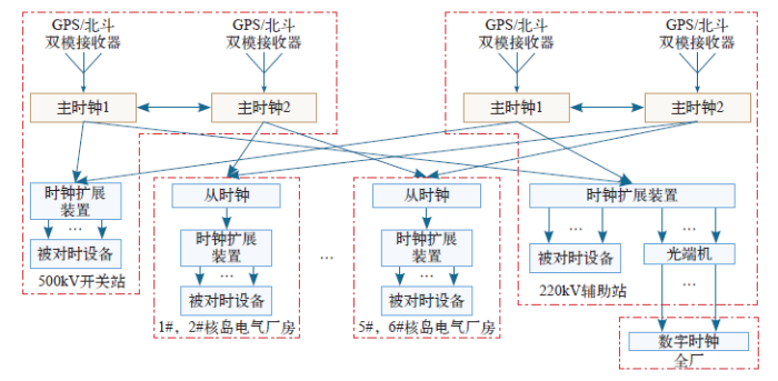 在500kV开关站和220kV辅助变电站内各设置一套独立主时钟系统,以满足这两个厂房内电气设备的对时需求。主时钟系统配置两台主时钟,并且这两台主时钟之间通过IRIG-B码进行互相对时。在核岛电气厂房内设置一台从时钟,从时钟接收来自主时钟的时间基准信号并对时间信号进行扩展。所有的对时扩展装置和从时钟的对时基准信号分别来自上述两套独立的时钟系统,保证时钟信号源的高度可靠性。另外,位于220kV辅助变电内的光端机将IRIG-B电信号变为IRIG-B光信号,通过树状光纤网络给全厂的数字时钟对时。