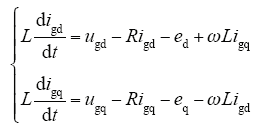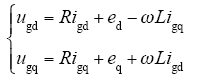 式中,ugd、ugq分别为网侧变流器输出电压矢量的d、q轴分量;igd、igq分别为网侧变流器输出电流矢量的d、q轴分量;ed、eq分别为电网电压矢量的d、q轴分量;R为网侧变流器进线电阻;L为网侧变流器进线电感;ω为电网角频率。