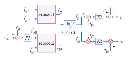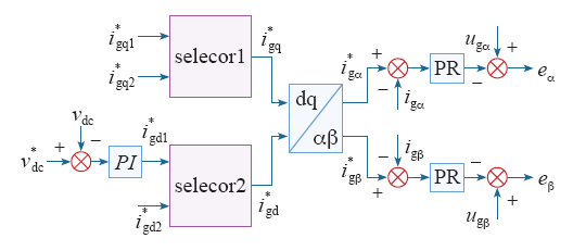 式中,ugd、ugq分别为网侧变流器输出电压的d、q轴分量;igd、igq分别为网侧变流器输出电流的d、q轴分量。网侧变流器的控制框图如图3所示,将i*gq1与i*gq2作为selector1的输入;将i*gd1和i*gd2作为selector2的输入信号。