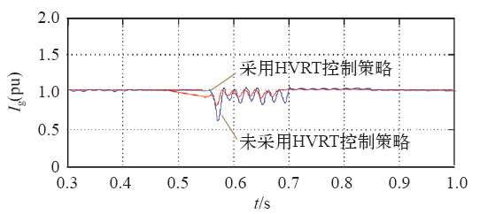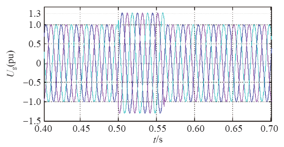工况1:电网电压在0.5s时骤升至1.3pu,持续60ms至0.56s,恢复至正常电压;